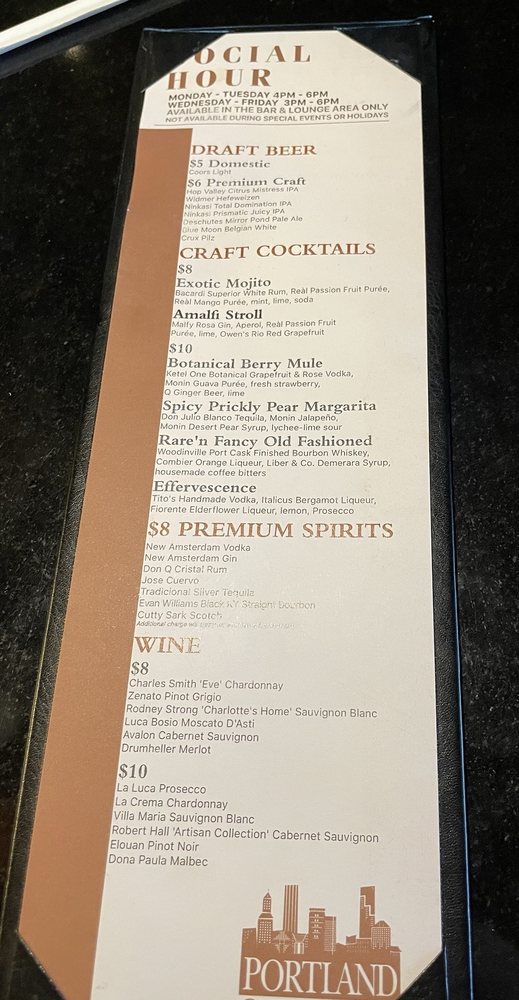 Portland City Grill, located in Portland, OR, offers a diverse menu of New American cuisine, seafood, and bar options. With a classy ambiance and stunning views of the city, it is perfect for a special night out or a happy hour gathering. The restaurant provides vegan options, limited vegetarian choices, and a variety of parking options.
